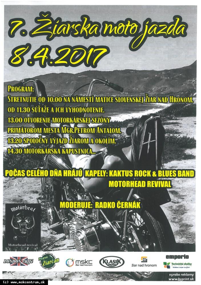 Srdečne Vás pozývame na 7. ročník Žiarskej moto jazdy. Počas celého dňa sprevádzajú kapely: Kaktus Rock & Blues Band a Motorhead Revival. Moderuje: Radko Černák.